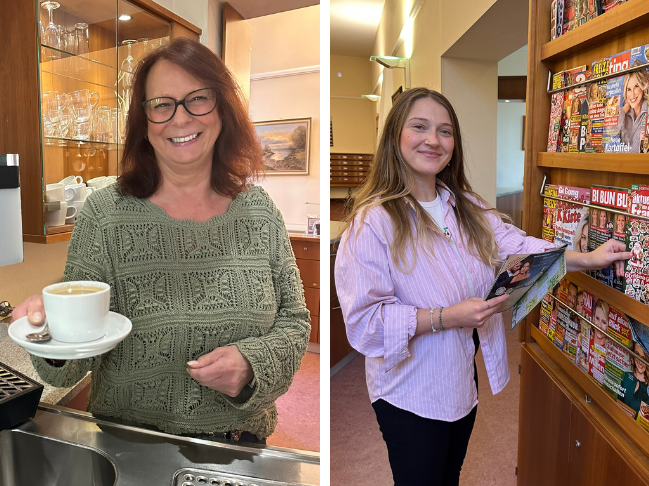 Zwischendurch machen die Rezeptionistinnen auch Kaffee – für Bewohner, für Gäste, für Mitarbeiter. Denn im Kurhaus am Park ist die Rezeption auch Cafébar inklusive Mini-Kiosk. Hier kann man Kaffee & Kuchen bestellen – direkt im Kurhausstübchen nebenan – und man kann Süßigkeiten, Zeitschriften, die Ersatz-Zahnbürste und andere Drogerieprodukte kaufen. Das ist nicht nur nett, sondern auch sehr praktisch.