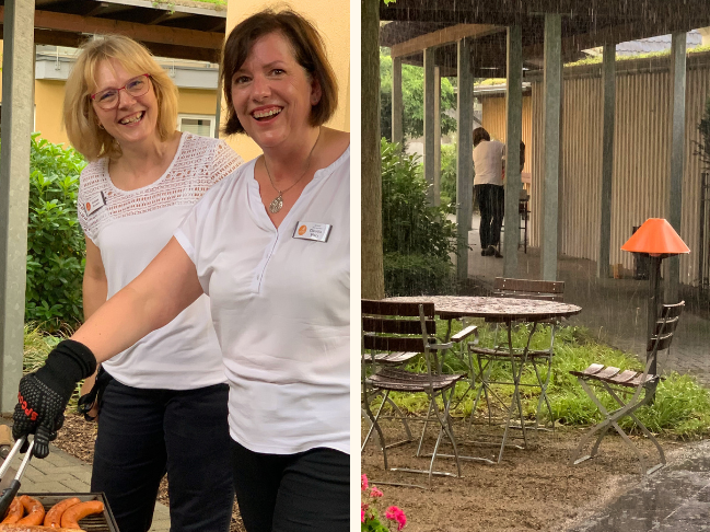 Im letzten Jahr feierten die Mieter der Wohnanlage „Wohnen am Kurhaus“ bei strahlendem Sonnenschein ein wunderschönes Grillfest. Das sollte auch in diesem Jahr so sein. Doch der Dienstag im Juli, für den das Fest geplant war, ließ nichts Gutes erhoffen. Die Wetterprognose wurde beinahe stündlich angeschaut, doch es half nichts. Mit dem Eintreffen der Gäste setzte auch der heftige Regen ein. Doch die Mitarbeiterinnen des Servicemanagements waren auf alles vorbereitet. Schnell wurde statt der Terrasse der Gesellschaftsraum hergerichtet und alle fanden einen Platz.
